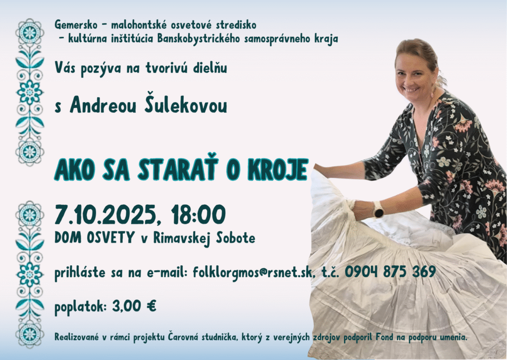 Svoju účasť na tvorivej dielni prosíme nahlásiť vopred elektronicky na folklorgmos@rsnet.sk; resp. telefonicky: 0904 875 369.