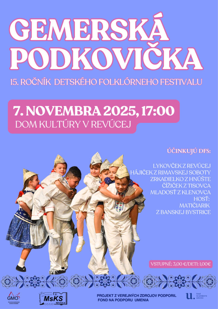 Gemersko - malohontské osvetové stredisko v Rimavskej Sobote – kultúrna inštitúcia Banskobystrického samosprávneho kraja v spolupráci s Mestským kultúrnym strediskom v Revúcej Vás srdečne pozývajú na 15. ročník detského folklórneho festivalu GEMERSKÁ PODKOVIČKA, ktorý sa uskutoční v piatok 7. novembra 2025.