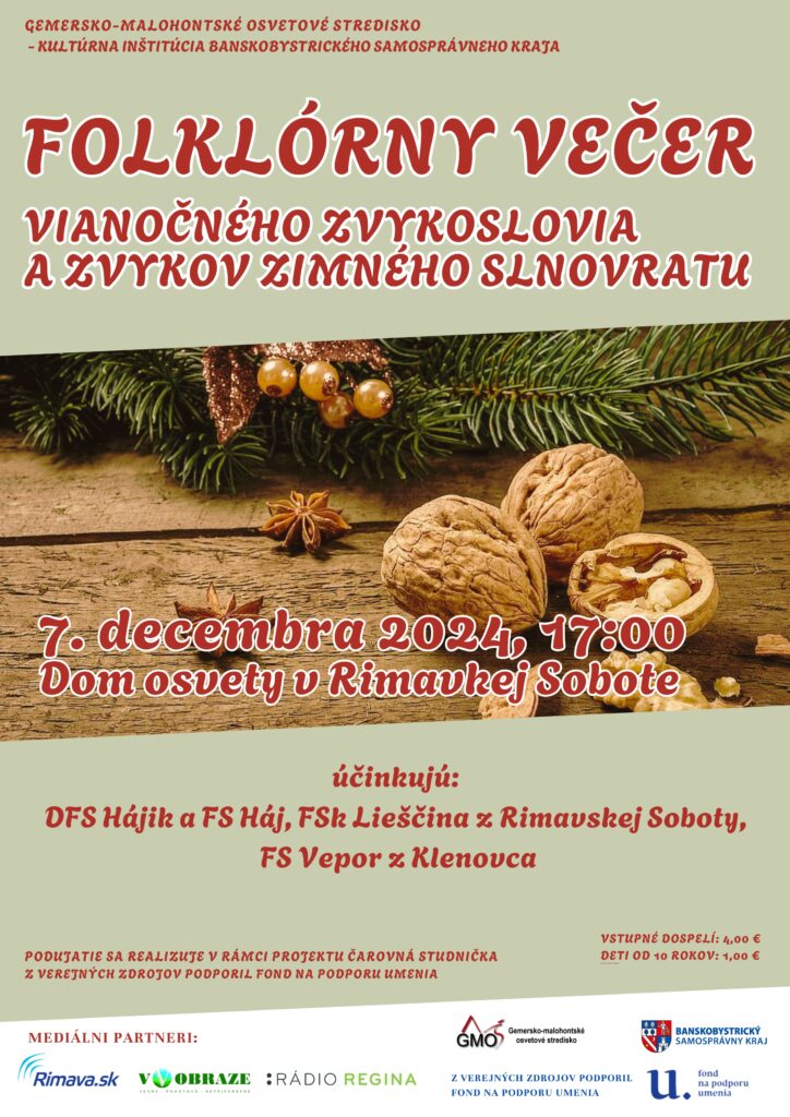 Gemersko-malohontské osvetové stredisko - kultúrna inštitúcia Banskobystrického samosprávneho kraja vás dňa 7. decembra pozýva do svojich priestorov Domu osvety v Rimavskej Sobote, kde sa uskutoční Folklórny večer vianočného zvykoslovia a zvykov zimného slnovratu.