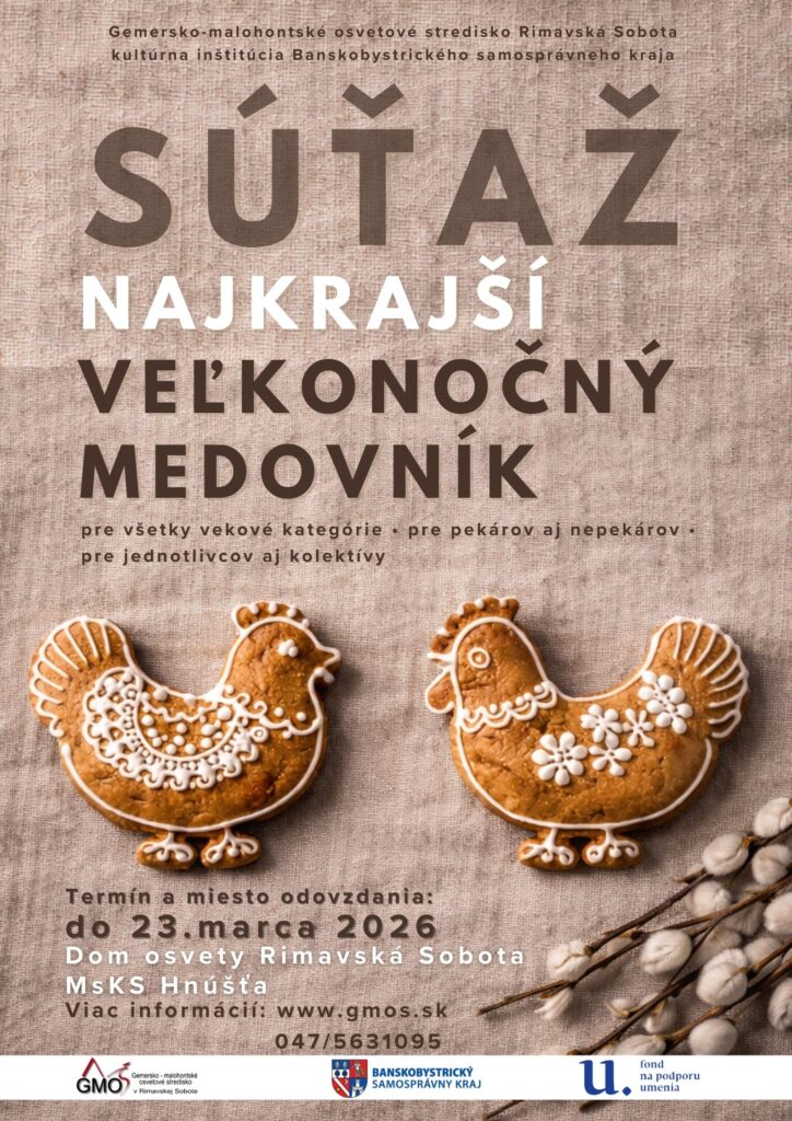 Gemersko - malohontské osvetové stredisko Rimavská Sobota - kultúrna inštitúcia banskobystrického samosprávneho kraja vyhlasuje súťaž Najkrajší veľkonočný medovník a pozýva všetkých, ktorí radi pečú a zdobia medovníky nielen na Vianoce, aby sa zapojili do spoločnej sladkej výzvy s veľkonočnou tematikou.